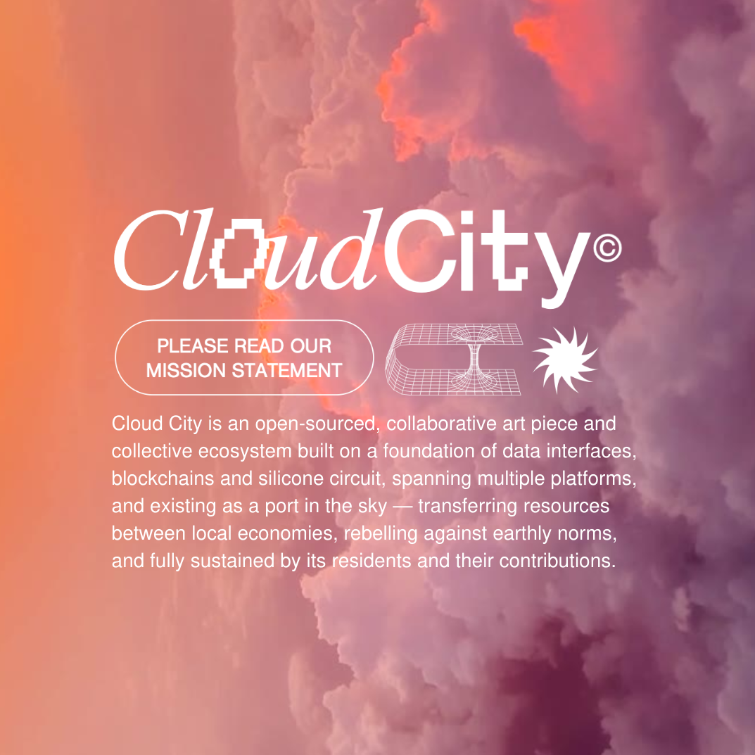 Cloud City is an open-sourced, collaborative art piece and collective ecosystem built on a foundation of data interfaces, blockchains and silicone circuit, spanning multiple platforms, and existing as a port in the sky — transferring resources between local economies, rebelling against earthly norms, and fully sustained by its residents and their contributions.